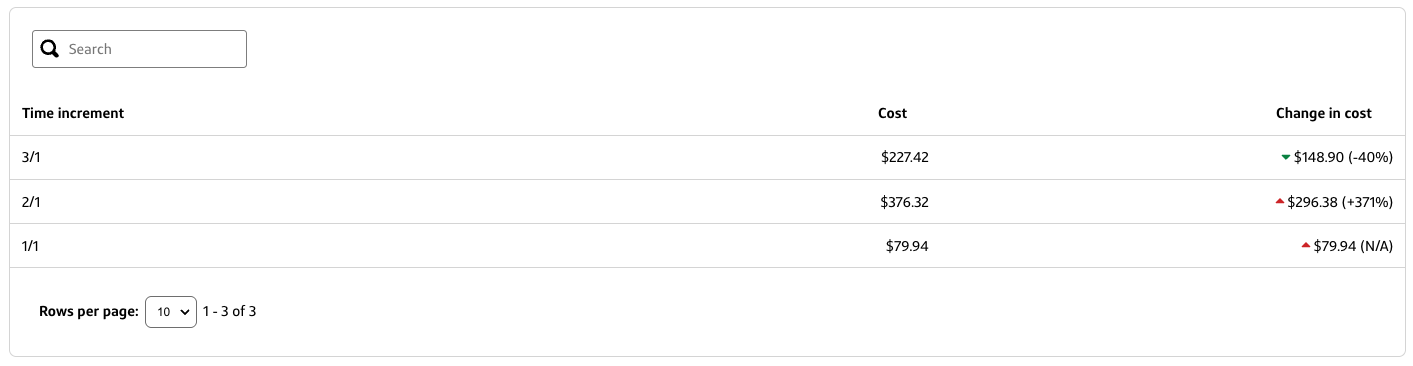 The AI/ML object details table provides a tabular view of the object’s Cost and Change in cost for each Time increment in the selected date range.