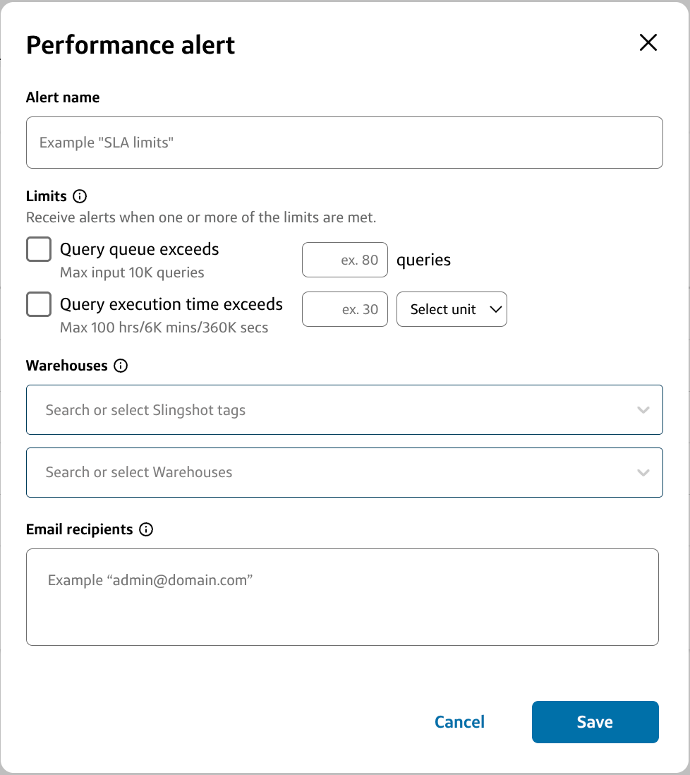 In order to have more confidence in the quality of Slingshot’s schedule recommendations, you can now set custom performance thresholds to alert you (and/or any member of your teams) if a warehouse has experienced unexpected spikes in two key performance metrics: query queuing and query execution time.